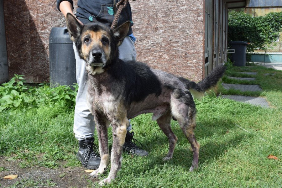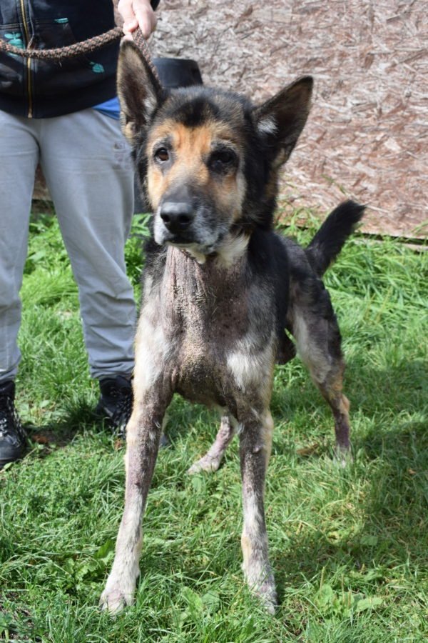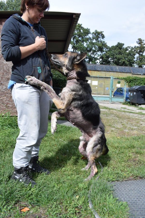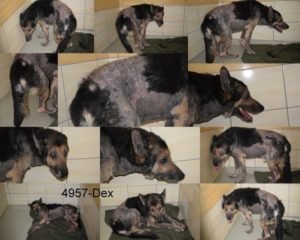 ——————————————————O Dexovi jsme se dozvěděli na základě telefonátu, volala paní z obce, že umřel soused a zůstal po něm pes a že jej rodina chce utratit. Okamžitě jsme volali starostovi a řešili co bude se psem, bylo nám řečeno, že jej vážně chtějí utratit, neboť je asi prašivý a na umření. Na to jsme mu řekli, že o tom zda je na tom tak špatně by měl rozhodnout veterinární lékař a nabídli pomoc. Ještě ten den jsme se pro Dexe vydali, žil v domě, byl plachý a vystrašený, hlídal si to poslední pouto s pánečkem a to domov. Nicméně podařilo se jej nakonec odchytit a naložit do auta. Olysalý byl z větší části po celém těle, přerostlé drápy a nic moc výživný stav. Nejspíš byl jeho páneček dlouhodobě již nemocný a psa byť měl rád (nebyl na zahradě v kotci, byl přímo v domě) nezvládal již se o něj řádně postarat.