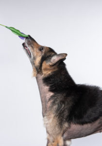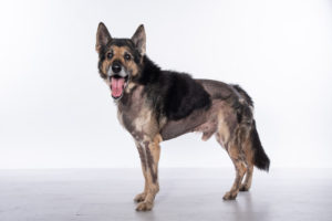 Vyděšený, bez chlupů, hubený pes, který nechápal proč zůstal v domě sám a kdo jsou ti lidé co se tu náhle objevili……