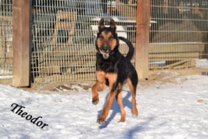 Theodor, Theo, stále veselý, stále vysmátý, poslušný, zlatý pes, rozdávající radost a energii. U nás strávil celé tři roky. To už je doba, za kterou si pak takového úžasného chuligána zamilujete jako vlastního. Navíc po tom, co jste spolu prožili. Theo byl v útulku dlouho, stále se nenacházel ten správný páníček. Všechny zastrašil svým zuřivým štěkotem na cizí lidi. Nikdo si nenechal vysvětlit, že si prostě hlídá to své, že když jej z kotce vytáhneme, tak je z něj úžasný parťák. Jedna paní se rozhodla, že to s ním zkusí. Jaké bylo naše překvapení, když za pár dní volala, že ji Theo nechce pustit domů. Přijeli jsme na místo, s vidinou nejzlejší Theodorovi druhé tváře, kterou jsme dosud neznali. S odchytovými tyčemi a v plné polní, připravené na velkého zuřivého psa. Ještě cestou jsme se pohádali, kdo půjde první dovnitř a nechá se sežrat. Pak nás paní dovedla k domu. Theodor skákal za oknem jak pako a štěkal. Ne, že by nás nechtěl pustit dovnitř, on se právě těšil na to, že za ním jdeme. Jeho energie a láska z něj jen čišela. Tak se vrátil k nám do útulku.