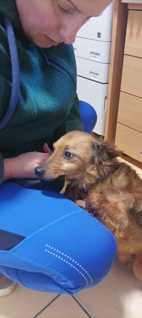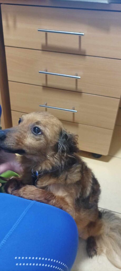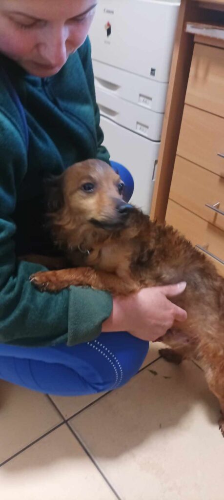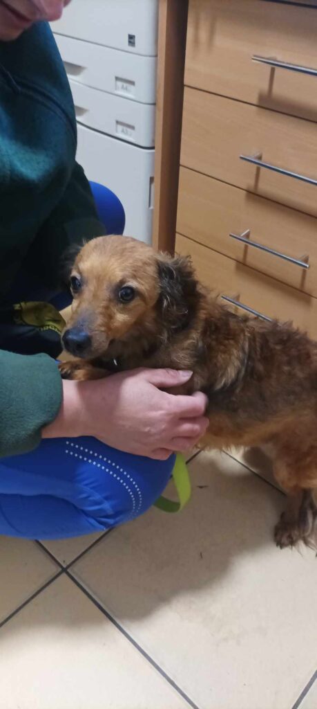 Poznámka:silně zablešený, vylysalý, staré zranění pes pravděpodobně po úrazu